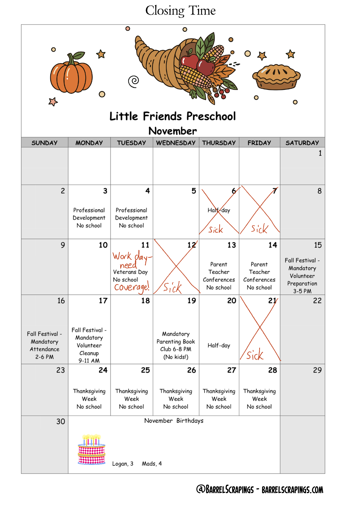 COMICS Closing Time Only slightly exaggerated from my son’s preschool. Clip-art credits: Birthday cake: BilliTheCat pixabay Thanksgiving motif: tanrıca pixabay Previous Comic Next Comic